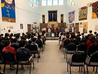 2月28日、行事委員さんのご尽力により、オーディトリウムの前にひな壇が飾られました。昨今の日本では、住宅事情などもあり、ケースに入ったコンパクトのものが主流となり、段飾りのものは珍しくなってきました。ここアメリカにおいては、ひな人形自体を飾るお宅はほとんどないと思いますので、子供たちにとって段飾りのひな人形が飾られるのはとてもありがたいことだと思います。