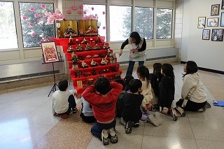 当日はひな人形の前で、担任の先生がそれぞれの人形の説明を行いました。子どもたちも神妙な面持ちで聞き入っていました。行事委員さんには、音楽を流していただいて、場の雰囲気を盛り上げていただいたりもしました。準備・片付けも大変だったと思います皆様ありがとうございました。