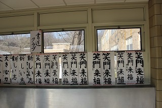 2月28日には、廊下に「習字クラブ」の作品が展示されました。条幅用紙に書かれた作品はどれも大変すばらしいのでした。文化祭を見学に多くの方々が、足を止め、作品を見ていました。講師の宇田先生には毎回、優しくていねいにご指導いただきました。毎回硯や文鎮など重い物を運んでいただいたり、片付けをしていただいています。毎回大変なご苦労いただきながらのご指導ありがとうございました。