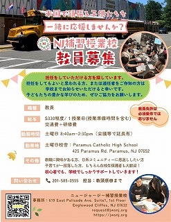 現在、次年度4月より補習授業校で担任・アシスタントをしていただける方を募集しております。ここアメリカで頑張る児童・生徒の支援をしていただけませんか?「担任はちょっとハードルが高い・・・」と可にていらっしゃる方も多いと思います。そんな方を対象に現在補習校では、「初任教員の授業支援を目的とした教師の指導教室」、「小さなお子さんがいらっしゃる方の登下校時のお子さんのお預かり」、「自分の子供の授業参観に行きたい!」と方が「担任やアシスタントをしながらも自分の子の授業参観等の学校行事への参加」ができるような支援体制を構築しています。(一部制限もありますが・・)