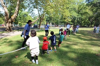 幼児部の園児は、お父さん、お母さんに手を引かれ、ニコニコしながら次々に集合場所にみんな集まってきました。午前中は、綱引きなどの親子で楽しむ「親子ゲーム」を行いました。一緒に汗を流し、で触れ合いを深めました。綱引きは、お父さんたちの気合いが入り、熱い戦いが繰り広げられていました。その後は親子でランチをとり、ランチ後は自由行動となり園内で交流を深めました。