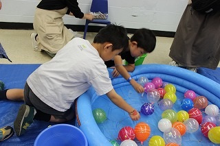 第一部は玄関ホールで実施しました。最初に年長さんが「クジラ」の乗った神輿を担いでホールを練り歩きました。その後みんなで「ソーラン節」「クジラの音頭」を踊って楽しみました。ランチをはさんで、午後からは「縁日ごっこ」を楽しみました。「ヨーヨー釣り」「金魚すくい」「的あて」「だるまさんのお引越し」にチャレンジしました。金魚を60匹以上すくいあげたり、ヨーヨーをバケツに入りきらないほど釣り上げる子がも見られ、驚く力を発揮する園児がたくさんいました